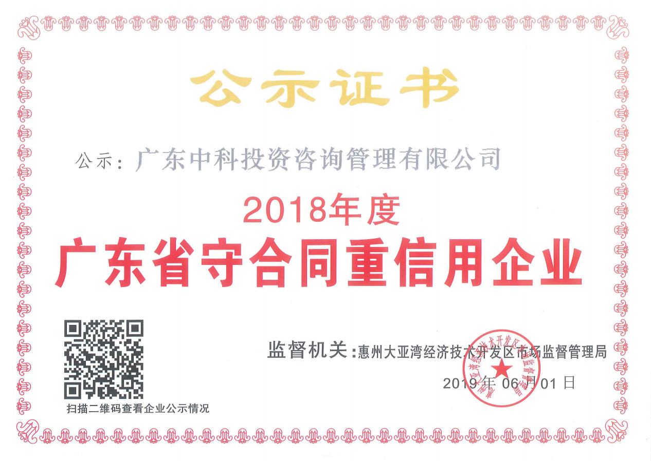 广东中科投资咨询管理有限公司(以下简称“公司”)凭借长期积累沉淀的强劲实力和始终如一的卓越服务,再次得到行业与社会的认可,获得“守合同重信用企业”荣誉证书,这是公司连续五年获得该荣誉。
